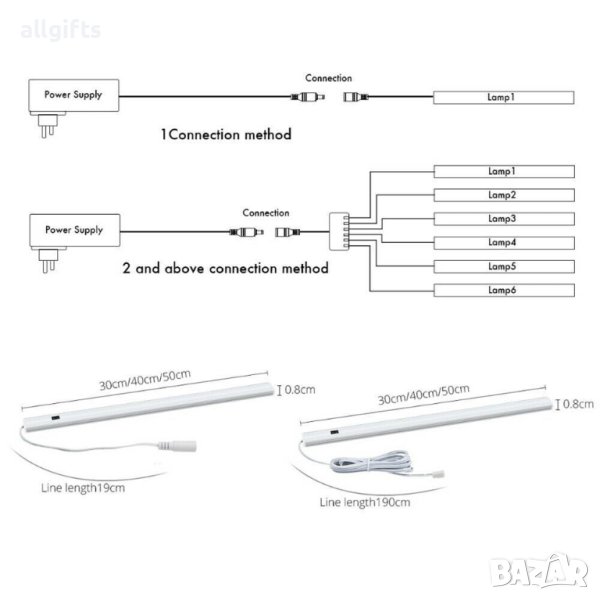 Дължината на едното осветително тяло е 50см., но ако вашия кухненски плот е по-голям, към едно захранване можете да свържете до 4 броя лед лампи със сензор, като всеки сензор ще си бъде независим и ще ползвате осветлението само където ви е нужно.