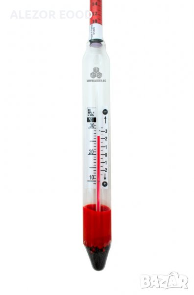 Хоби спиртомер с обхват от 0 до 100% и вграден термометър от гамата на ALLA Франция. Спиртомера е в комплект с индивидуална пластмасова кутия за съхранение и таблица с корекционни данни спрямо температурата на измервания алкохол.