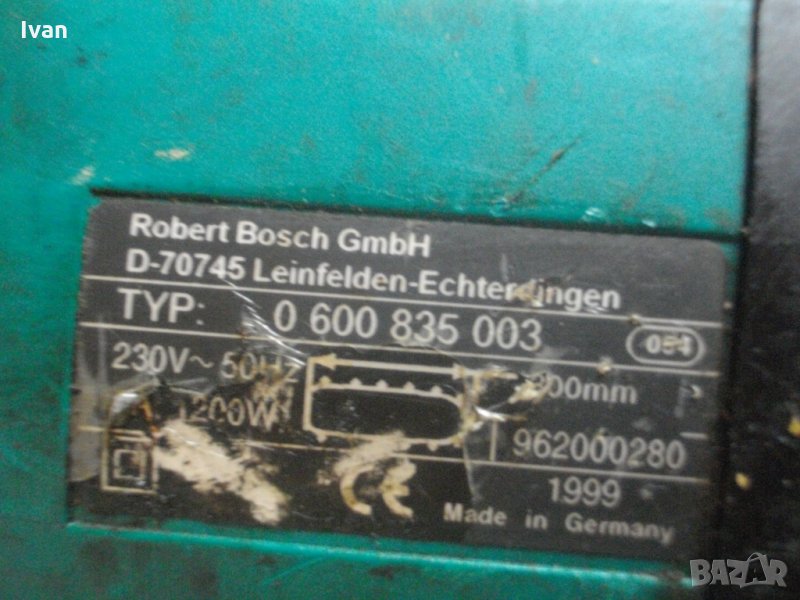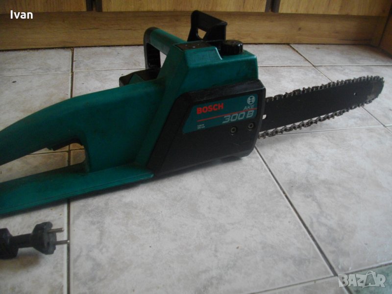 Полупрофесионален електрически трион верижен - резачка за дърва, 1200 ватов модел на Бош. Марка и модел - Bosch AKE 300 B. Производство - оригинално Германия - Made in Germany - вписано на маркировките. Внос Англия. С машината е работено, но е със запазен външен вид и добро техн.състояние. Всичко по машината си работи добре. Единствено като забележка - веригата е леко хлабава , и трябва да се смени с нова стегната, или по - често да се обтяга добре, върху шината. Мощност на мотора - 1200 вата, дължина на шината - 300мм. Наличие на спирачка предна. Предна дръжка. Оригинален кабел с оригинален щепсел - дължина 20 см.