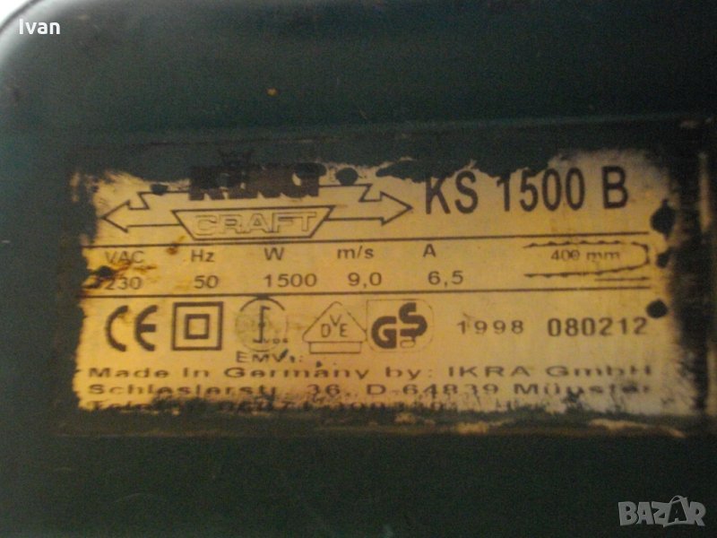 Почти нова масивна мощна и силна 2100 ватова ел.резачка,професионален модел на производител само на профи инструменти-Ikra.Машината е немско оригинално производство 2007 година,упоменато с маркировки.Марка и модел-King Craft MSI 2100.Много запазен външен вид и отлично техническо състояние.Работи много добре.Силно,мощно,бързо,ефективно при работа.Мощност на мотора-2100 вата,скорост при работа-9м/секунда.Дължина шина-40см,верига-оригинална немска,с много добре фабрично заточени зъби.Прозрачен показател за ниво масло.Регулатор впръскване на маслото,разположен на резервоара.Твръдосплавна пластмасова,широка и удобна,спирачка.Голяма масивна дръжка.Тегло на машината-5кг.