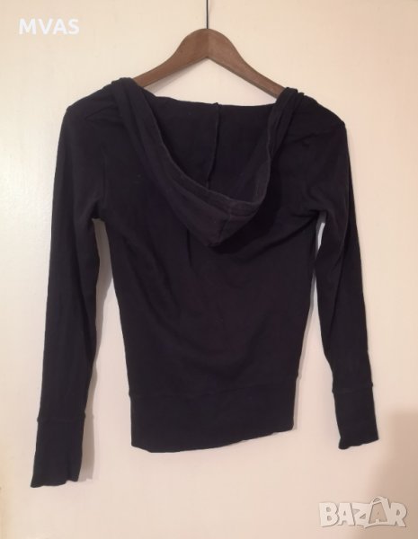 Нов черен дамски суичър/худи с качулка. Втален, по тялото седи, не е дебел, има джобчета отпред.