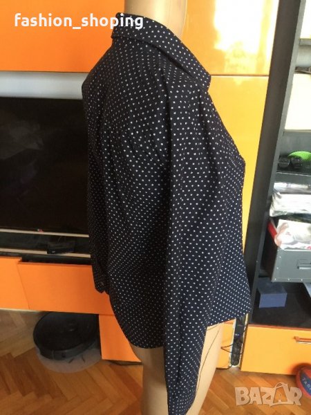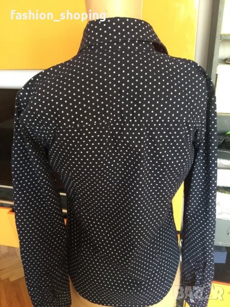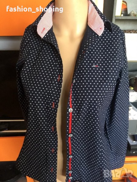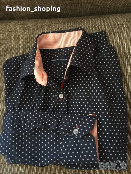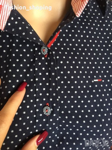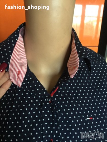 Страхотна риза на известния бранд Tommy Hilfiger. Ризата е с тъмносин фон, с десен малки бели звездички. Силен акцент са детайлите- облечените копчета, червения ширит, който върви по цялата дължина на закопчаването, червени илици, различен десен от основния на яката и на ръкавите.