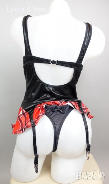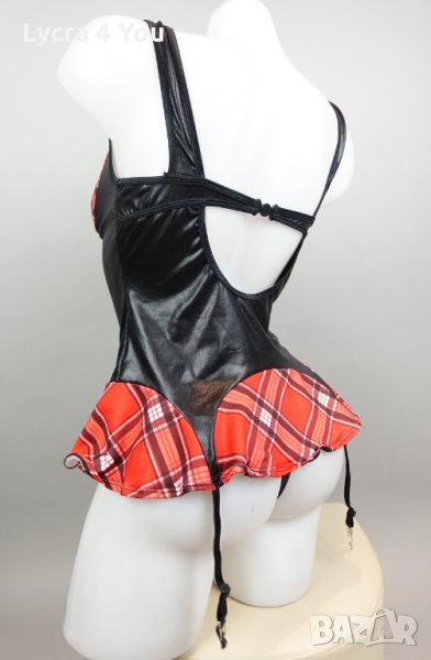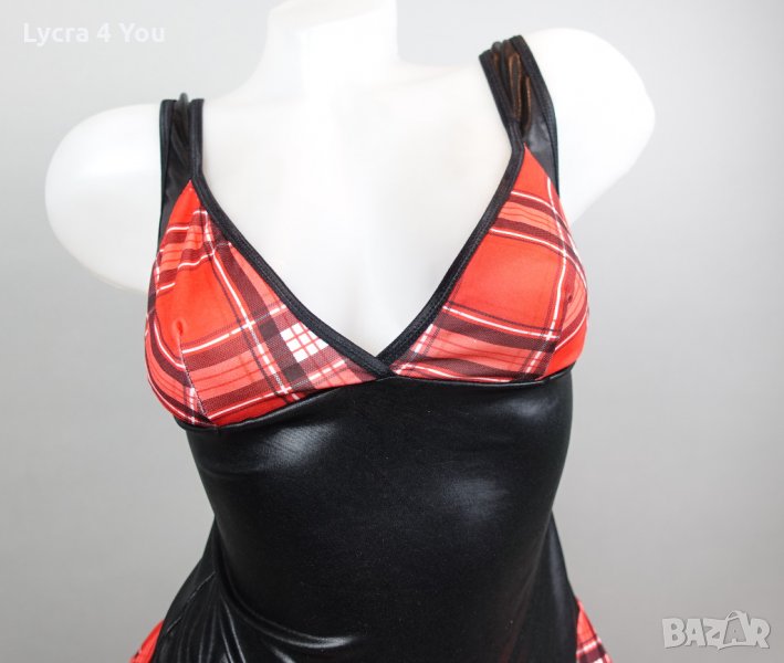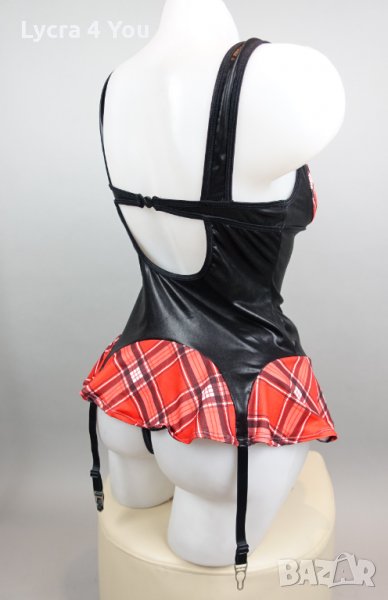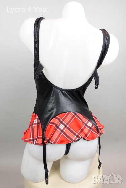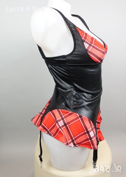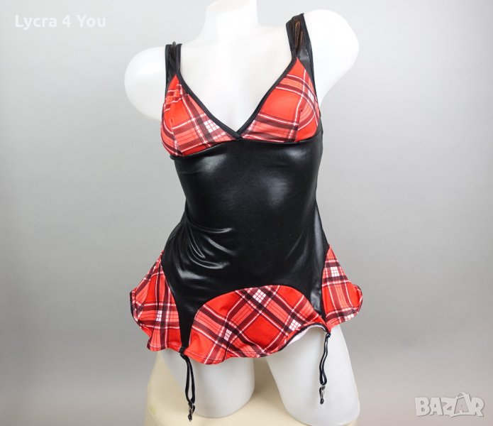 Като нов, без забележки, ползван веднъж костюм/рокля 'ученичка' , комбинация от лачена материя с еластичност и карирана част тип мини пола и каре на бюста. С 4 броя лачени коланчета жартиери с щипки за захващане на чорапки.