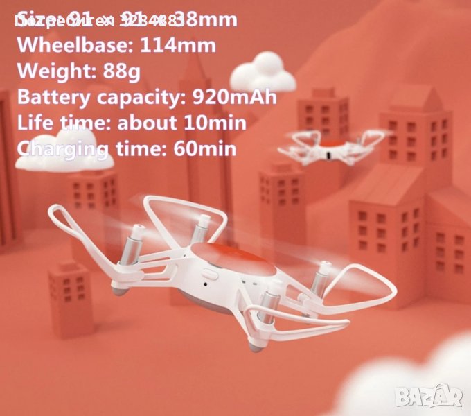 Wi-Fi модулът на дрона има обсег 50 метра. При това, максималната височина е 25 метра, а батерията с капацитет 920 mAh е достатъчна за 10 минути полет.