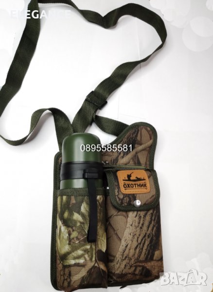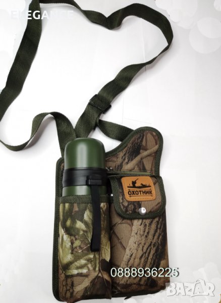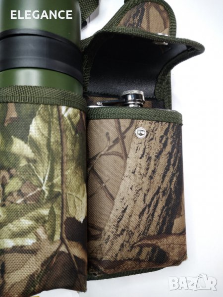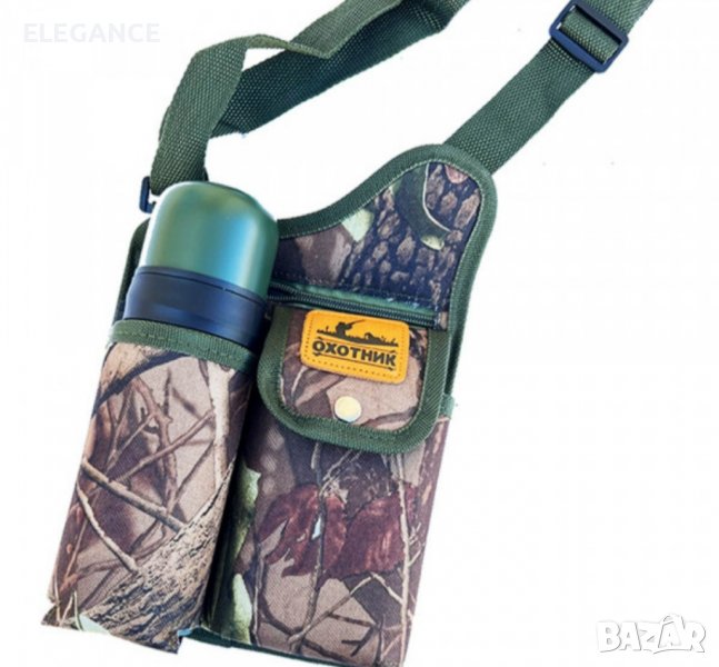 - камуфлажна чантичка с джобове за термоса, бутилката, жоб с цип сшшвместимост за кутия цигари или смартфон и ремък с дължина 140 смю метра за носене през рамо