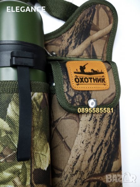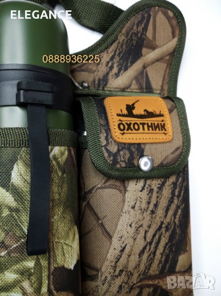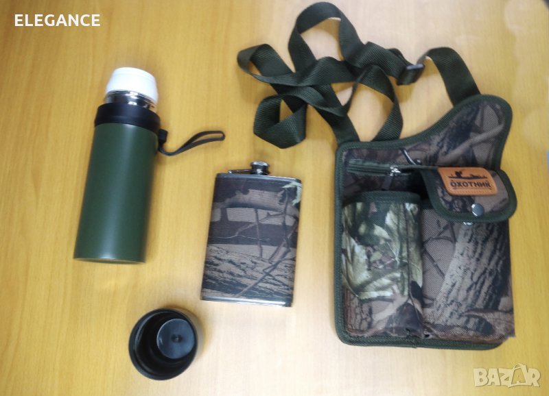 Чудесен комплект за през рамо на култовата марка ОХОТНИК: Ловен комплект - термус и манерка в кобур с ремък за рамо