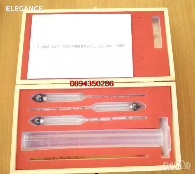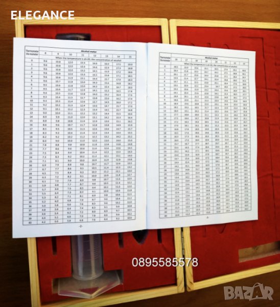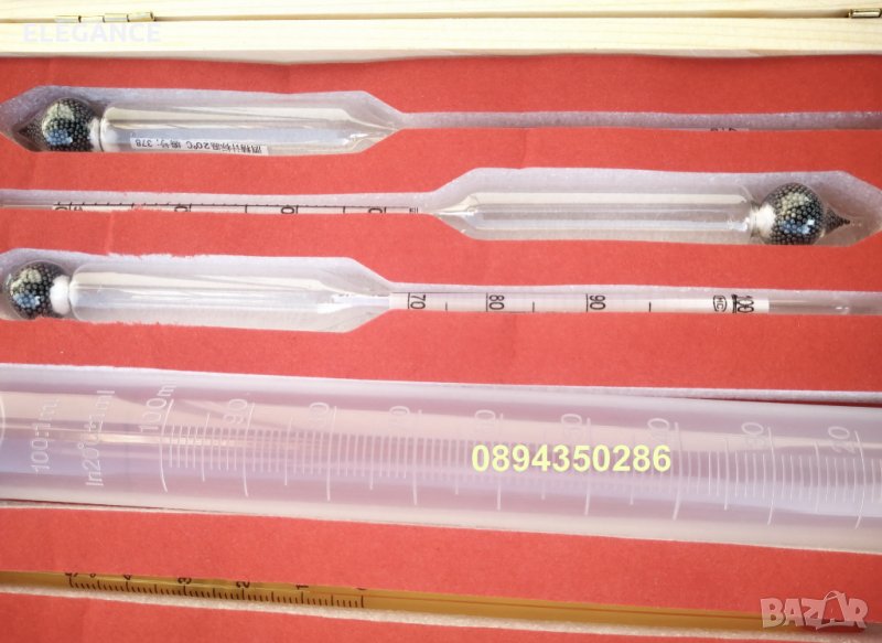 спиртомери за прецизно измерване съдържанието на алкохол в домашно приготвена ракия в обемни проценти по Br, с термометър и таблица за температурна корекция на показанията. (виж снимките )