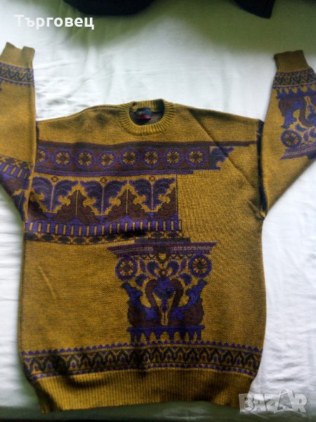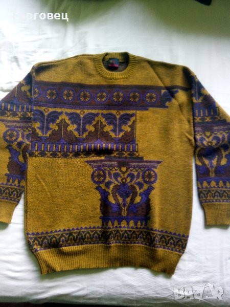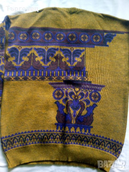 Пуловера е подходящ за студено време. Основния цвят е златист с шарки.