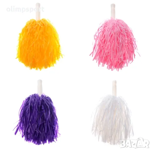 Помпон с тегло 100 г. Различни, лъскави цветове (сребрист, златист,зелен, син,червен, цикламен, лилав). Помпоните са с два вида захват – с дръжка и с ръкохватка с 2 ринга. Подходящи за детски, аматьорски и професионални мажоретни състави. Дължина на ресните - 30 см. Цената е за 1 брой. Материал - PVC