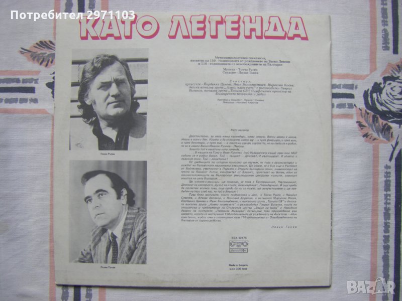 Грамофонна плоча - ВЕА 12175 - Като легенда: музикално-сценичен спектакъл, посветен на 150-годишнината от рождението на Васил Левски и 110-годишнината от освобождението на България