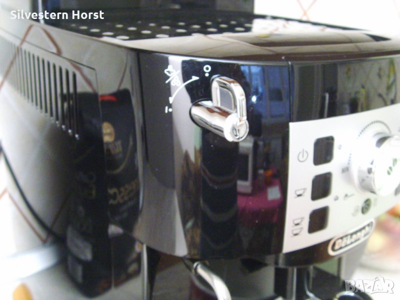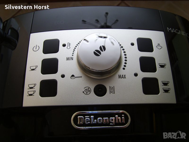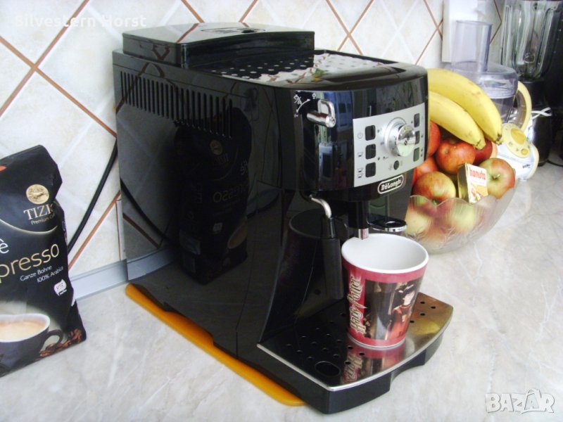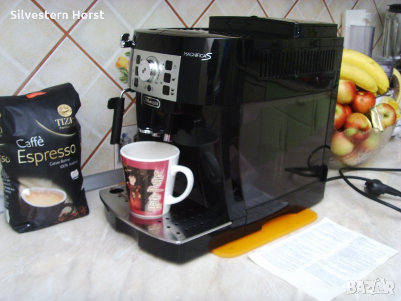 Производителност- " Delonghi " MagniFica S гарантира неустоимия вкус и високо качество на кафето ден след ден. Delonghi е единствената марка, която използва тази система: дюзата е поставена в центъра на системата termoblock с цел да предотврати загубата на топлина. Няма нужда да направите една или две чаши кафе преди да получите кафето с перфектната температура. Благодарение на подобренията Delonghi гарантира точно количество кафе в отделението за извличане, без значение качеството на използваните зърна. Спецификация Основни спецификации: Автоматичен тип апарат Вид напитки: Еспресо,Капучино,Caffe-Latte,Кафе,Чай,Горещ шоколад и какао Капацитет резервоар вода - 2.0л. Капацитет чаши - 2 Капацитет на отделение за кафе 500гр. Налягане - 15 бара Захранване - Кафе на зърна, смляно кафе Функции и програми: Вградена мелница Програмирано