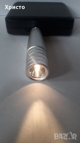 Продавам фенерче метално с връзка, работи с 1 брой батерия 1,5 волта ААА, която е чисто нова и е включена в цената. Масивен тежък алуминий, има и резервна крушка. Дължина на фенерчето 8,5 см, диаметър външен отпред ф2 см. В стабилна черна пластмасова кутия 9,5х9,5х2,5 см. Прекрасен подарък, чисто ново. Има го синьо/сребро и само сребро - 2 вида