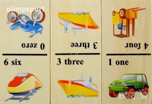 Занимателен и интересен вариант на класическото домино, предназначен за най- малките. Вместо точки на плочките са изобразени различни превозни средства, а също и числа, изписани на английски, което дава възможност на децата да ги опознаят и научат.