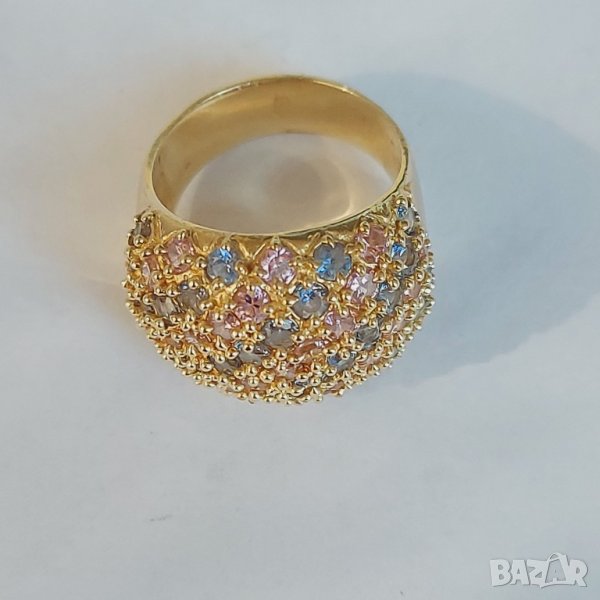 Златен пръстен 14 кр., 8,8 гр., обсипан с естествени розови турмалини и аквамарини. Размер 53.