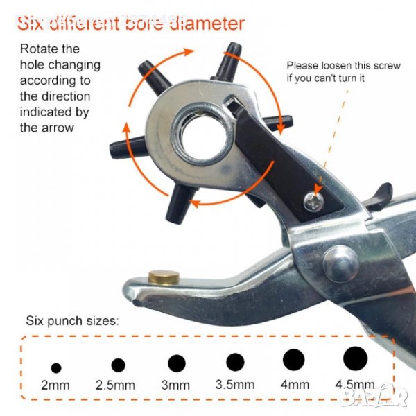 Клещи замба инструмент за пробиване на дупки на каишки за часовници, колани, кожа, пластмаса, плат, картон и др. или пробиване на отвори за поставяне на капси, рапиди, копчета за дънки или други дейности - 2мм, 2.5мм, 3мм, 3.5мм, 4мм, 4.5мм