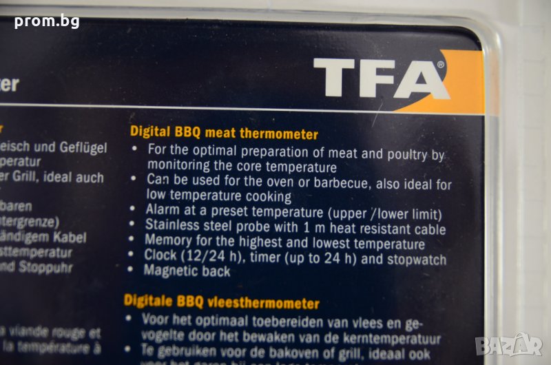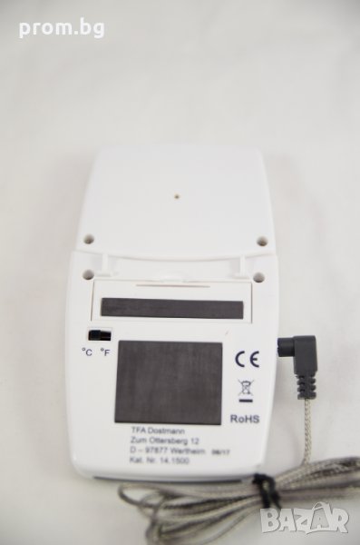 TFA електронен кухненски термо таймер, внос от Германия. За измерване на температурата по време на приготвяне на храна. Снабден с аларма при предварително зададена температура (горна / долна граница). Подходящ като термометър за печене на месо, за контрол на температурата във фурната.