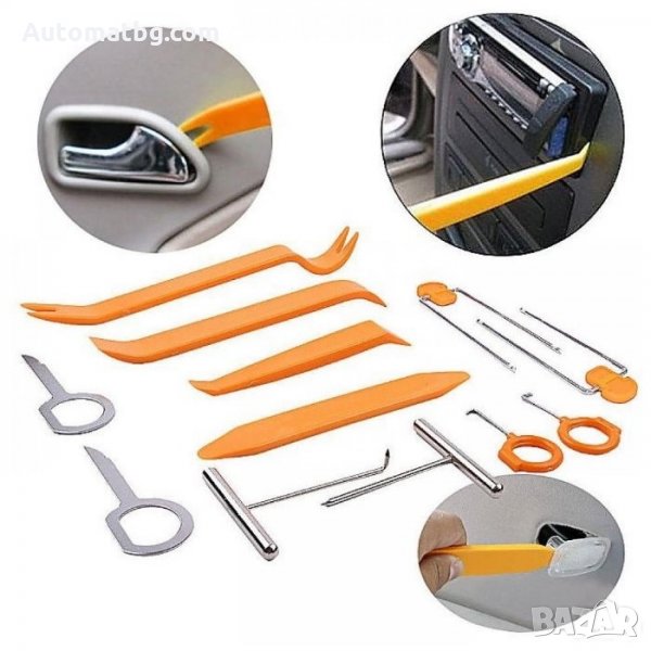Комплект щанги за демонтаж интериорни елементи. За вадене на щипки от кори на вратите, подкалниците, лайсните и др. В комплекта са включени и инструменти за демонтаж на авто радио, мултимедии.