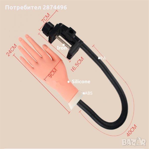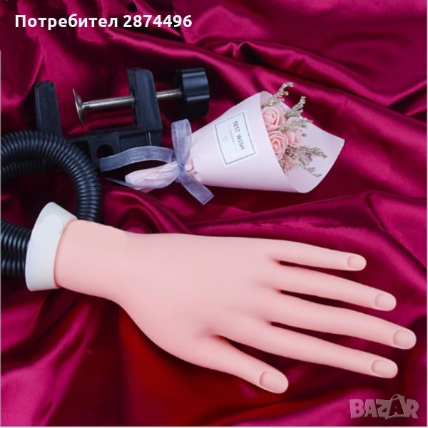 Учебна ръка за обучение при маникюр и ноктопластика. Има специално приспособление за статично захващане. Материал пластмаса и силикон.