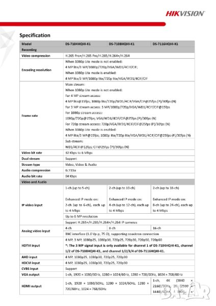 * Запис на камери за видеонаблюдение с резолюция до 4MP Lite (1280x1440) за TVI/AHD/CVI; 2 мегапиксела (1920x1080), 3 Mегапиксела за канал 1 и канал 2.