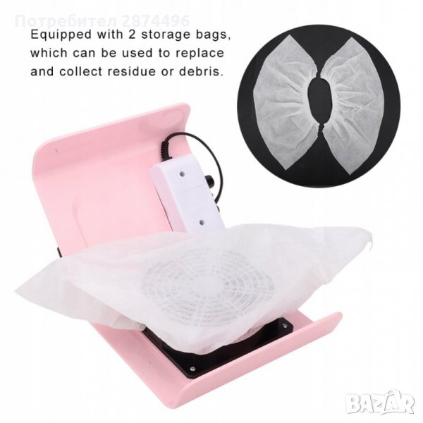 Докато работите, уредът всмуква праха, получен от изпиляването на ноктите и предпазва както работната Ви маса, така и Вас от вдишването на финия прах. Формата му създава удобство, а покритието му е меко и може да се почиства лесно.