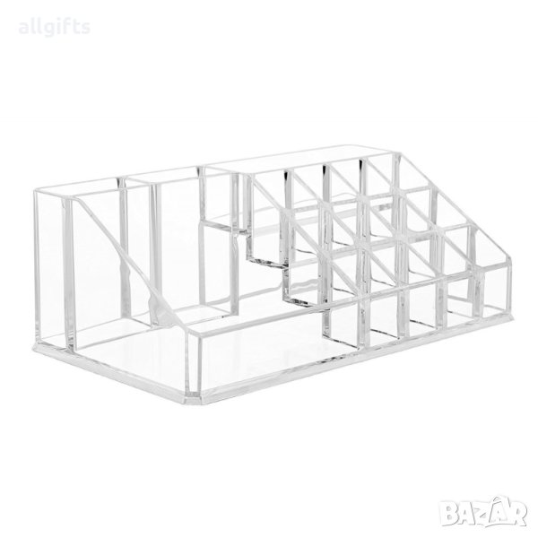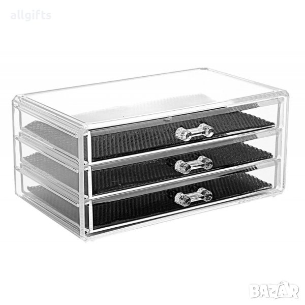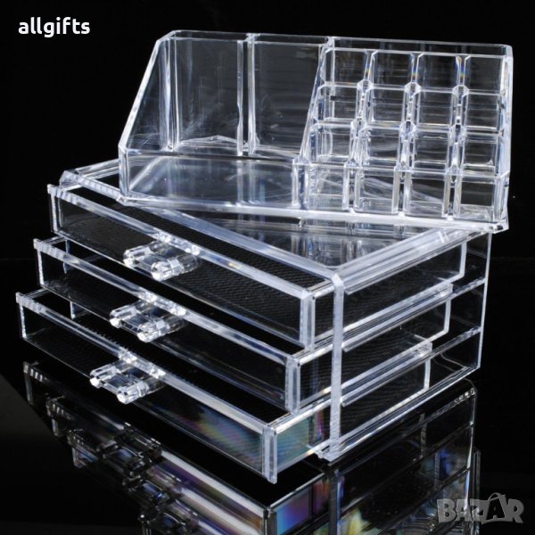 Органайзера се състои от 2 части които могат да се ползват по отделно. Долната част е от 3 чекмеджета, а горната част е за гримове предимно. Несъмнено има място за него на Вашата тоалетка. Луксозен органайзер за козметика и бижута с много отделения и три чекмеджета. 16 горно разположени отделения. Всичките ви гримове и козметика ще бъдат прилежно подредени и лесно достъпни. Само с един поглед вие ще намирате каквото търсите. Въведете ред в дома си.