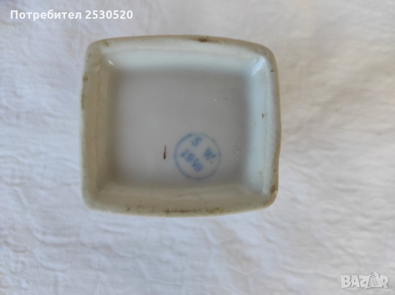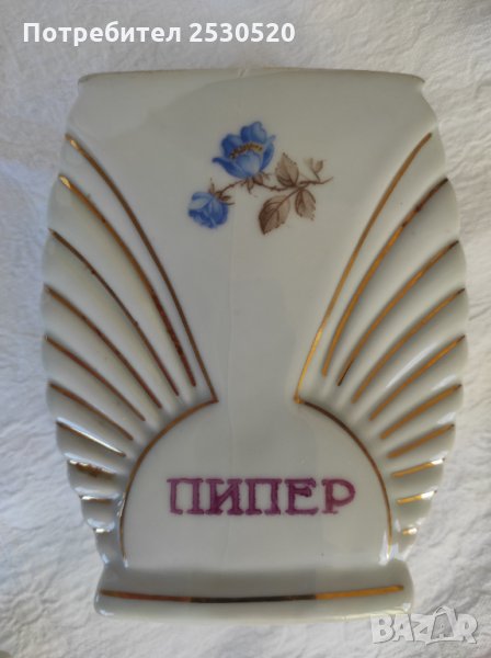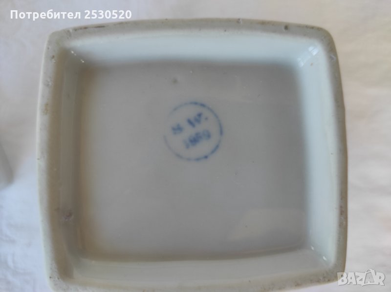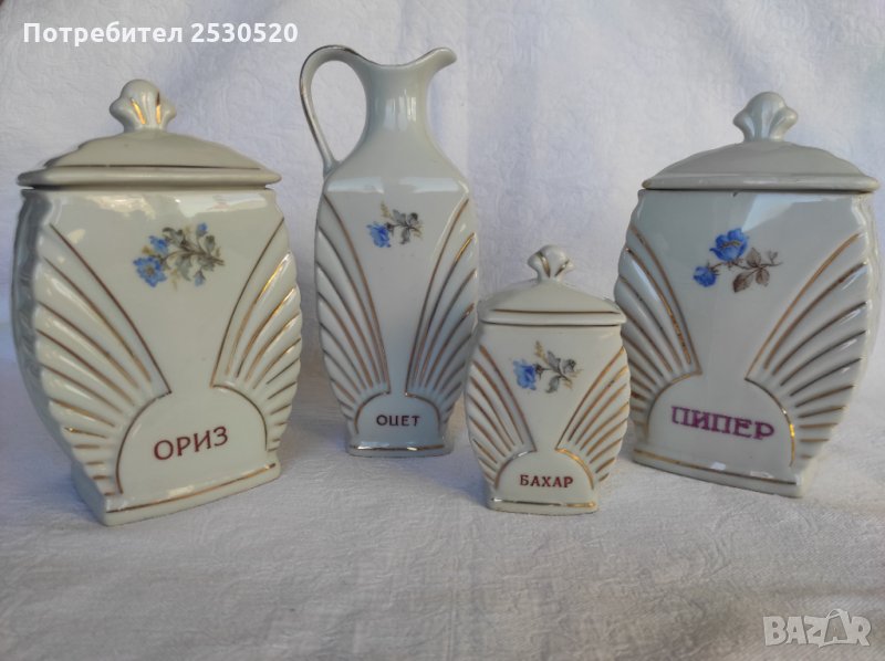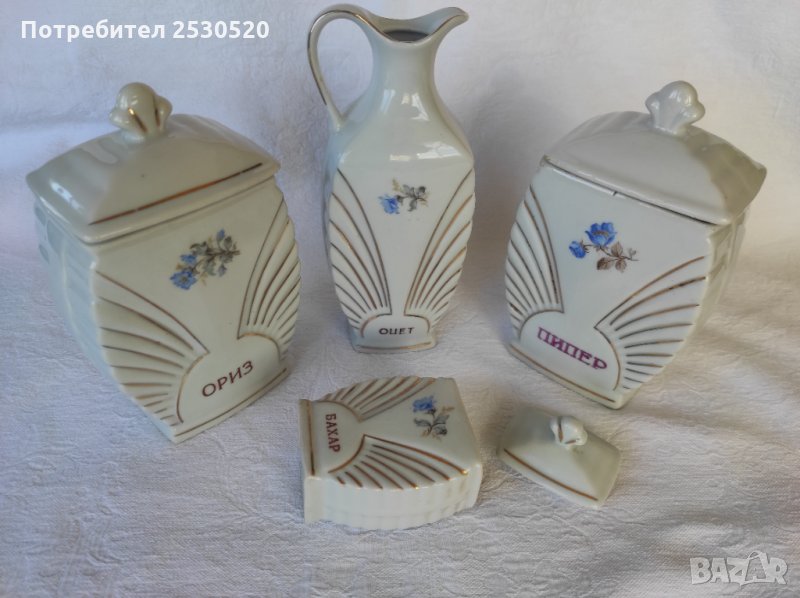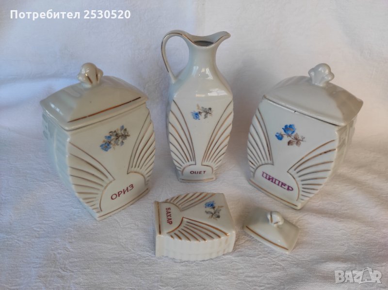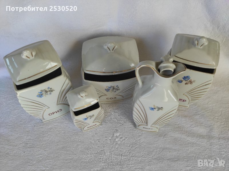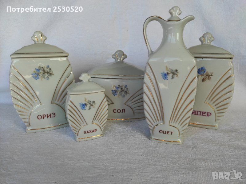 Включва шише за масло и 4 броя съдове за подправки с 4 броя капачета. Отлично запазени, порцеланът е с хубава глазура, тънкостенен (2 мм).