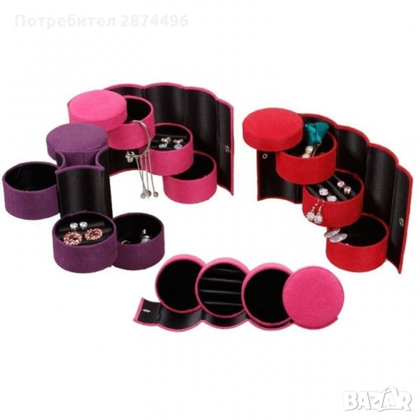 Кутията е с автоматично отваряне. Първото ниво е подходящо за подреждане на обеци, брошки и пръстени