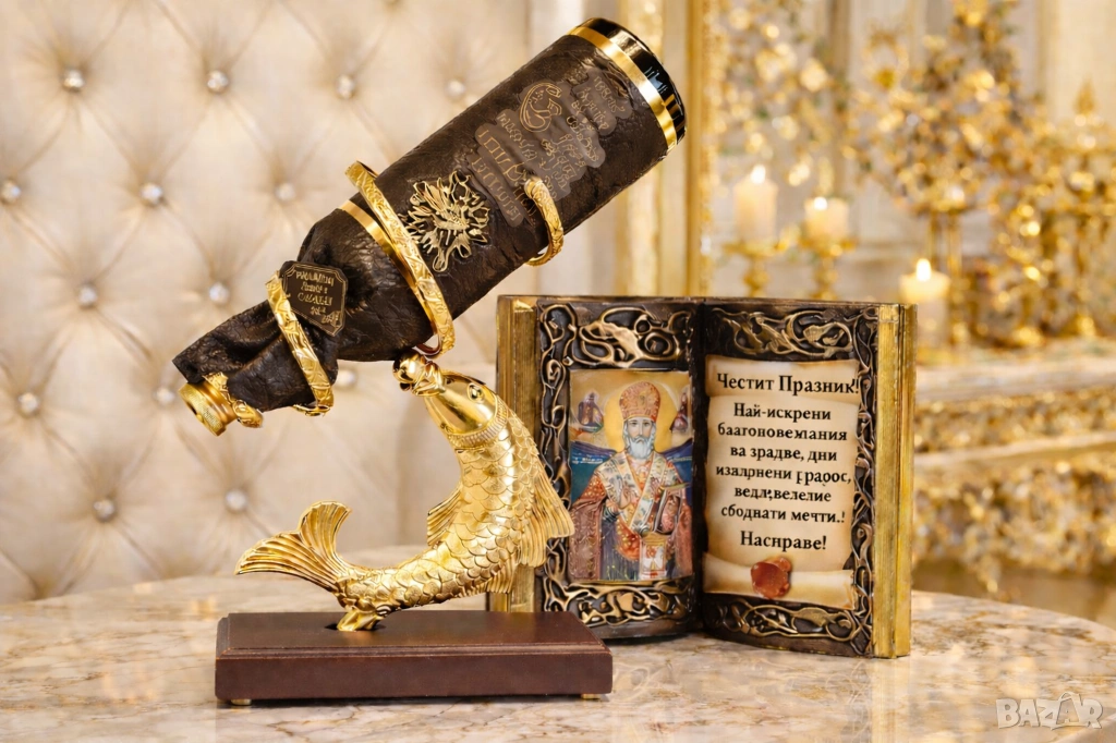 Златна риба от месинг и махагон с декорирана, юбилейна бутилка за всякаква кръгла годишнина и юбилей : 50, 60, 70, 75 или 80 години.