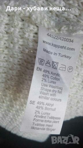 Много красива, мека жилетка, която е подходяща за повод и разходка.Матеруята е съставена от полиакрил и памук.Цветът ѝ е много светло екрю, с добавена златиста нишка от ламе.Биетата са черни.Закопчава се най-горе, посредством две секретни кукички.