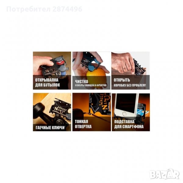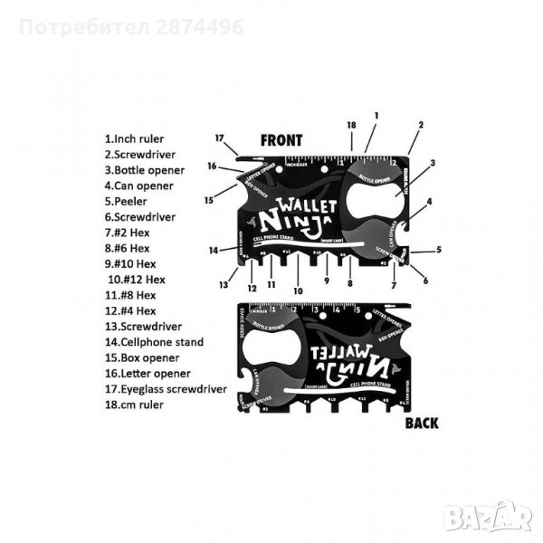Оригиналният инструмент Wallet Ninja 18 в 1 е перфектният подарък за всеки, който обича практичността и удобството. Без значение дами или господа, всички ще бъдат възхитени. Идеалният помощник за всяка ситуация ще улесни ежедневието ви. Комбинира в себе си множество инструменти, посредством които с лекота ще можете да завивате болтове, да отваряте консерви или бутилки, да режете хартия и още куп други дейности. С малко повече въображение можете да го използвате и като поставка за смартфон, създавайки си допълнително удобство.