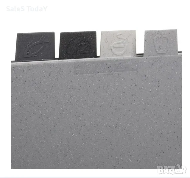 Комплект от 4 режещи повърхности на база за съхранение. Всяка повърхност има „ухо“ с изображение на храната, съдържа отделна повърхност за плодове/зеленчуци, месо, пиле и риба. Изработени са с непоресто покритие, за да не събират остатъци и предотвратяват нежеланото пренасяне на миризми. Като използвате различна повърхност за обработване на сурова храна преди готвене, вие осигурявате хигиеничен процес.Основата ви позволява да ги съхранявате след измиване, защото те могат и се оттичат напълно и изсъхват без повреди.