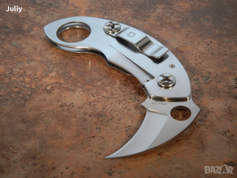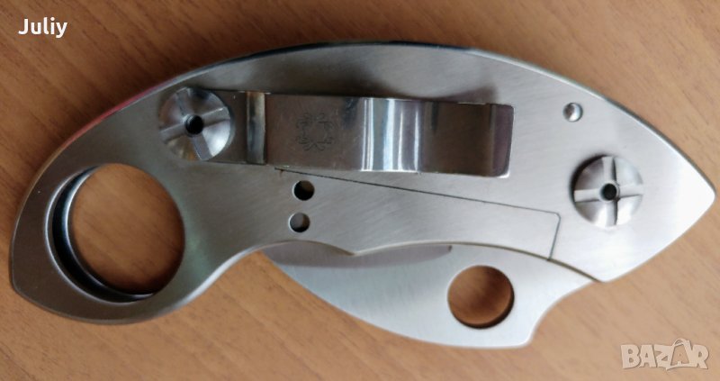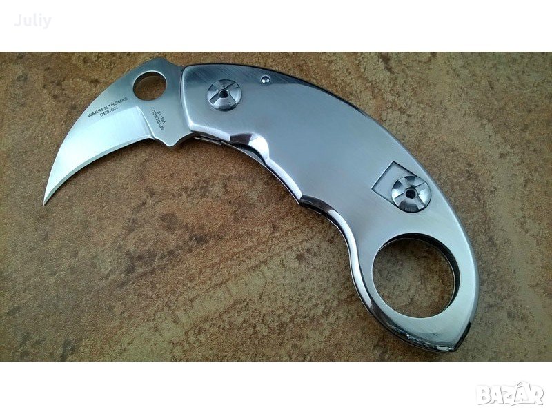 Стоманена дръжка, приятна на допир, лежи удобно в ръката, пръстен "карамбит", отвор на острието с диаметър 1,3 см за отваряне с една ръка.