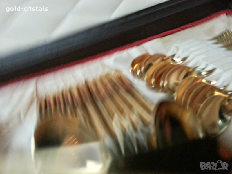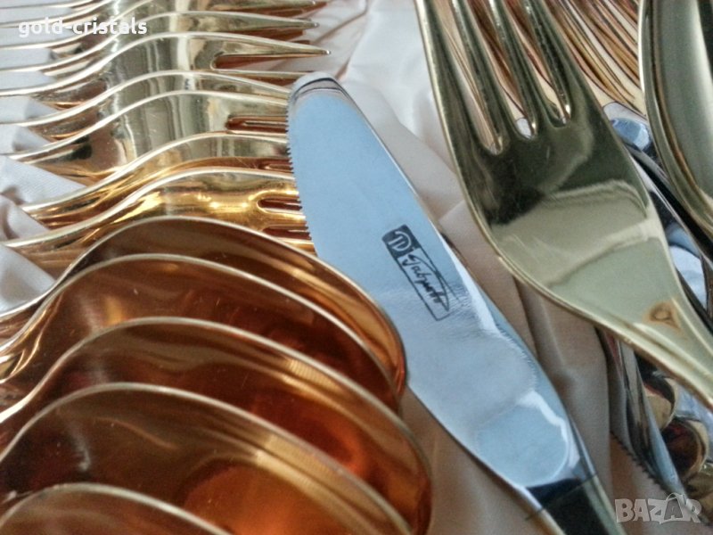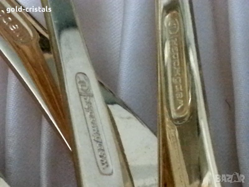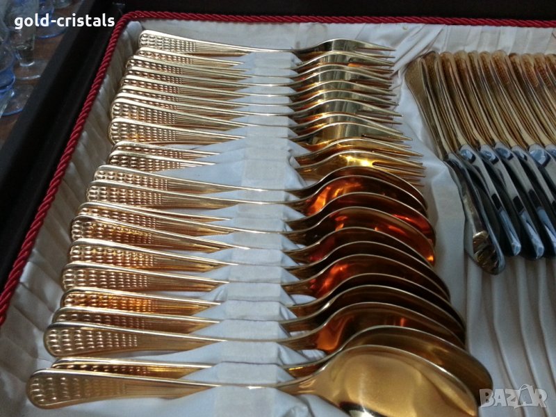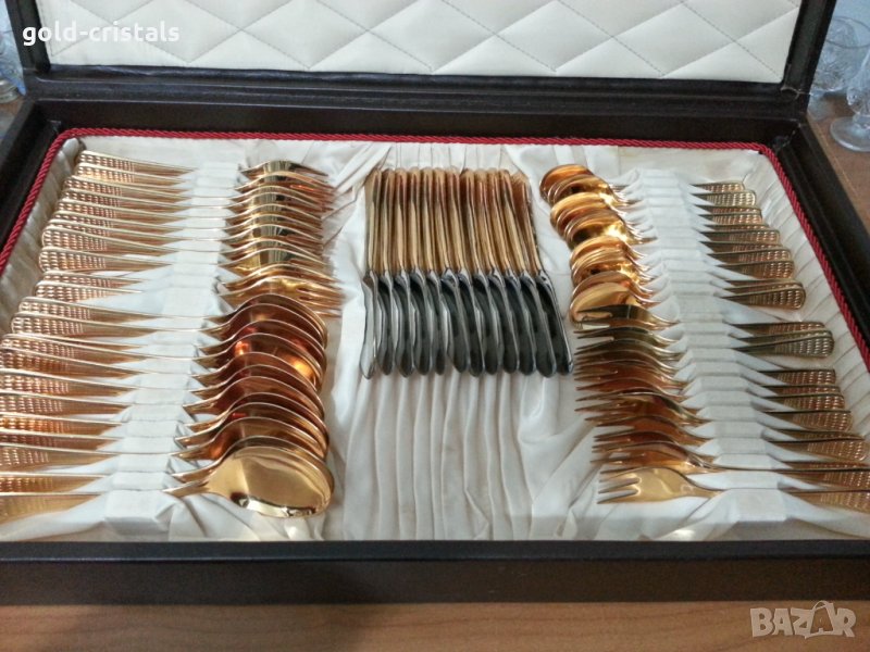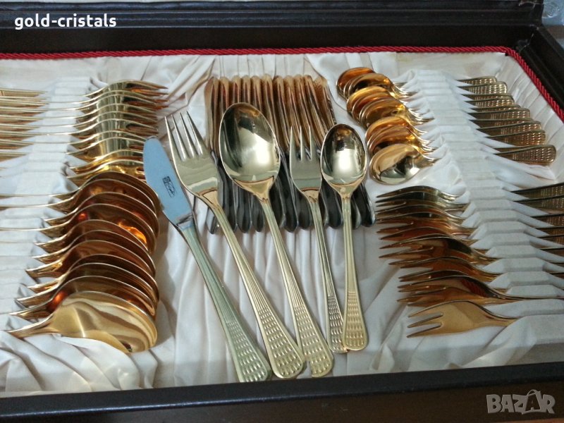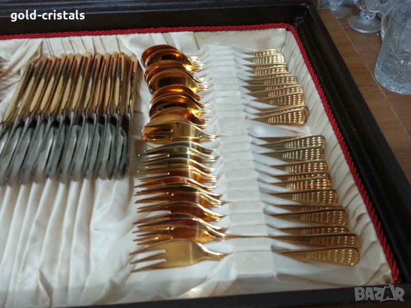 Стари български прибори за хранене позлатени Петко Денев Перла маркирани чисто нови в куфар среден размер ножове 12бр вилици среден размер 12бр лъжици среден размер 12бр лъжички десертни за чай кафе 12бр вилички десертни 12бр маркирани неръждаеми сервиз комплект сет лот ретро арт декор винтидж стил колекция старинни антикварни предмети обзавеждане за дома и семейството подходящи за подарък за ценители и колекционери