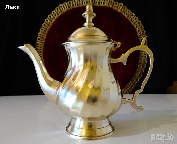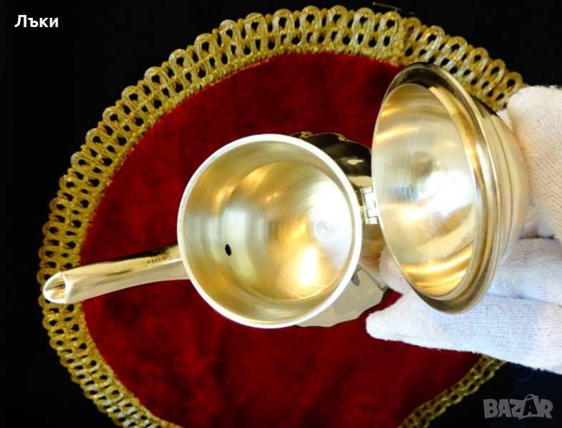 Старинна немска кана за ракия,чайник,майсторска ръчна изработка от масивен бронз.Има златен блясък,който ефектно са подчертава от многостенния профил на каната.Височина 15 см.,дължина 16 см.,диаметър 8 см.,тегло 430 гр.Вместимост 350 мл.