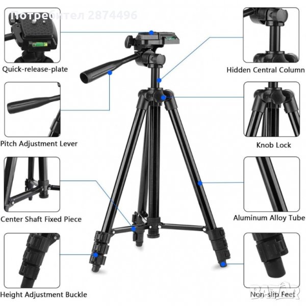 ***Посочената цена е САМО за трипода. Другите аксесоари показани на някои от снимките, като държач за телефон, държач за GoPro, блутут дистанционно и калъф за трипода се закупуват отделно, като допълнителни аксесоари.