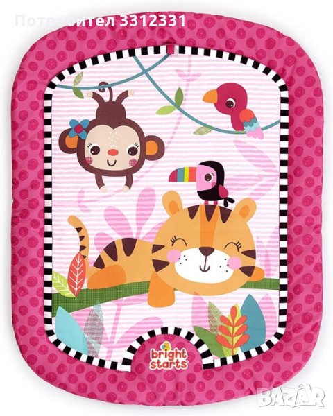 Килимчето има удобна възглавничка, на която бебето да се облегне, 2 бр. играчки и гайки, на които могат да се закачат и други дрънкалки.