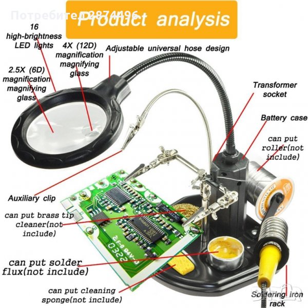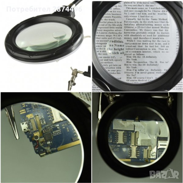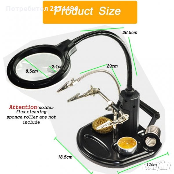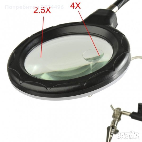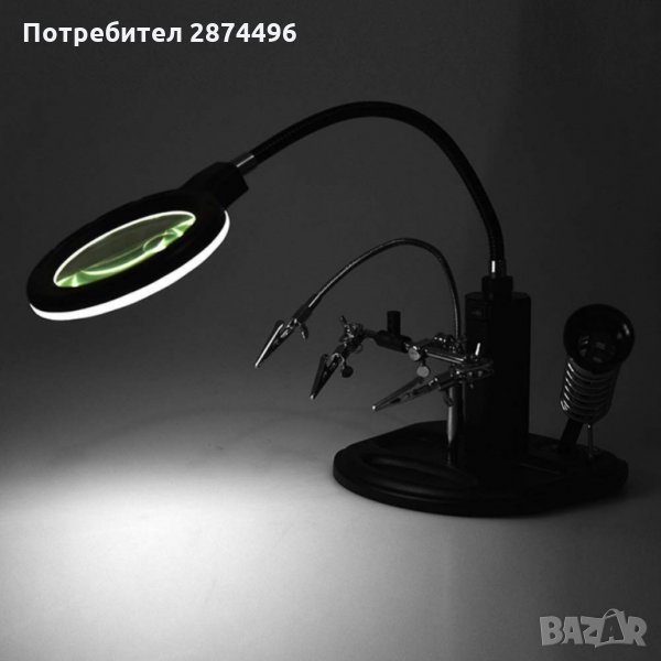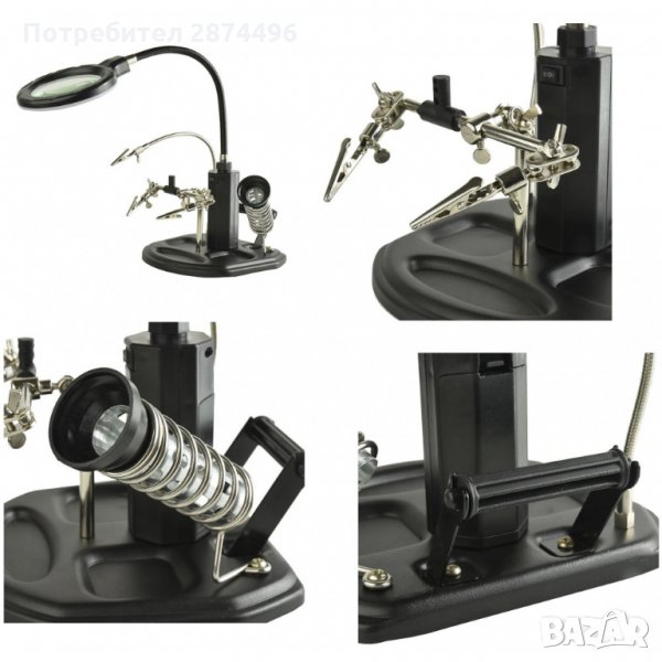 Тя ни позволява да фиксираме частта неподвижно с помощта на скобите(крокодил), а висококачествените лещи осигуряват перфектно увеличение на обекта без значение размерите му. Включени са две допълнителни мини-лещи, които са инсталират под основната и имат диаметър 35 mm и увеличението им е 2х или 5х. Третата ръка има led подсветка, която свети ярко (5 светодиода) и се захранва както от батерии, така и от 220V.Характеристики: