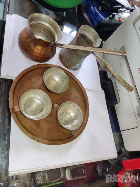 Продавам поднос с чаши. Старинни, ръчно ковани. Подноса с чашите струва 60лв. Медните джезвета са продадени. Продавам и голям бакърен меден котел с размери-диаметър 45см, височина 30 см. за 300лв, (тоест САМО за две грамчета злато) и друг по-малък за 181 лв. Може бартер за злато-смятам го по 150 лв. за грам! Без коментар по цената! Всичко се увеличава (особено цветните метали)! Няма как аз да намалявам цени. При закупуване на повече неща (и от другите ми обяви), разбира се, че ще има ГОЛЕМИ отстъпки от цената!