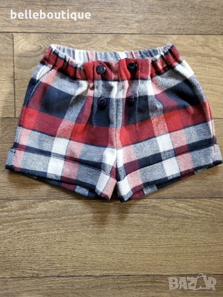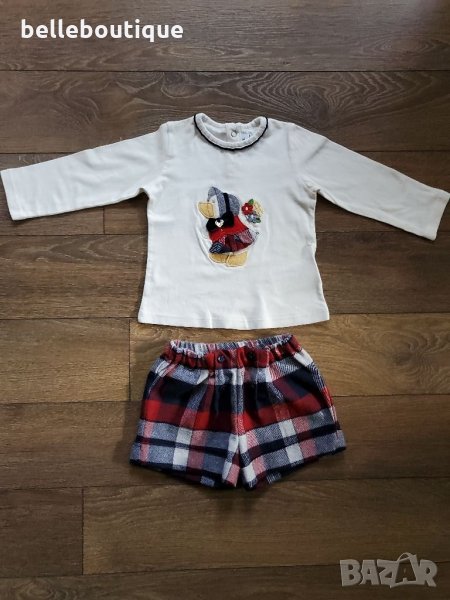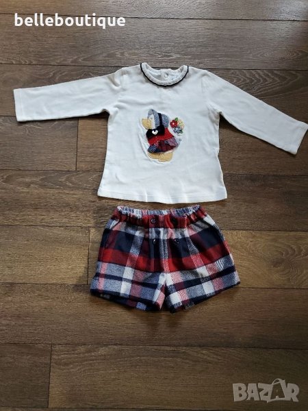 Уникален комплект от две части на испанската марка Майорал за малка госпожица. Включва блуза с дълъг ръкав с красива апликация "пате" и къси карирани панталони. Блузата е декорирана с метална емблема сърце с лого. Комплектът е обличан само за повод и е като чисто нов с етикети към него.