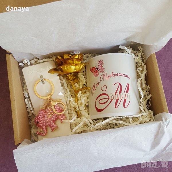 Уникално красив подарък за най-прекрасната МАМА, който включва чаша с надпис “Най-прекрасната МАМА”, златна роза, за да ѝ напомня винаги, че мама е златна и блестящ ключодържател с форма на слонче, обсипано с розови камъчета, което ще ѝ носи много късмет. Всичко това е поместено в красива картонена кутия. Този подарък ще направи всяка майка на-щастливата мама на света!