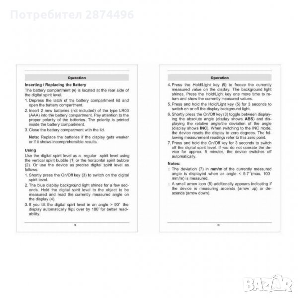 Дигитален нивелир/инклиномер позволява прецизно измерване в диапазон от 0 до 360˚ с допустимо отклонение от 0.1˚. Със същата точност, уредът измерва и наклон, като резултатите могат да се преобразуват в градуси и милиметри с точност до 100 мм/м. Захранва се от 2 x 1.5V AAA батерии с работен капацитет от 200 часа непрекъсната работа. Безпроблемната работа на измервателния уред е гарантирана при температурни амплитуди от 5 до 50˚С и при относителна влажност +/- 85%.