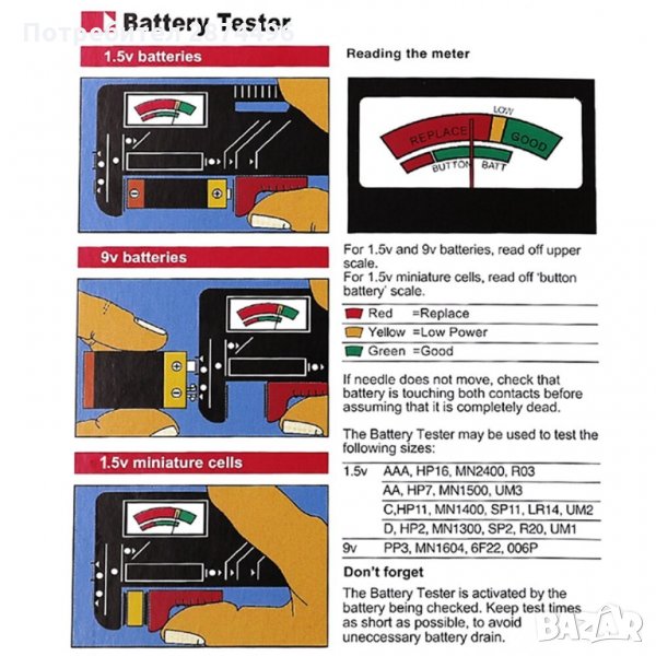 Тестер за батерии R03/AAA LR03 R03U HP16 MN2400, R6/AA LR6 HP7 MN1500 UM3, R14/C HP11 MN1400 SP11 LR14 UM2, R20/D HP2 MN1300 SP2 LR20 UM1, 6F22/9V PP3.