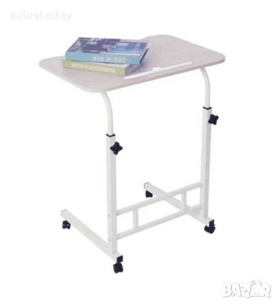 Странична маса - бюро с дървена повърхност (MDF), метални крака и колелца. Повърхността има вдлъбнатина, в която можете да закачите таблет. Преносима е, краката с колелцата се побират под седалката ви (7 см), приближавайки я максимално близо, има регулируема височина на 75 и 63 см и е много лесна за съхранение.Размери на повърхността: 60x40x1 см