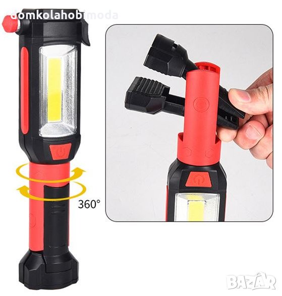 LED фенер, С кука и магнит и щипка за закрепване, Многофункционален, Два режима светене, Авариен чук