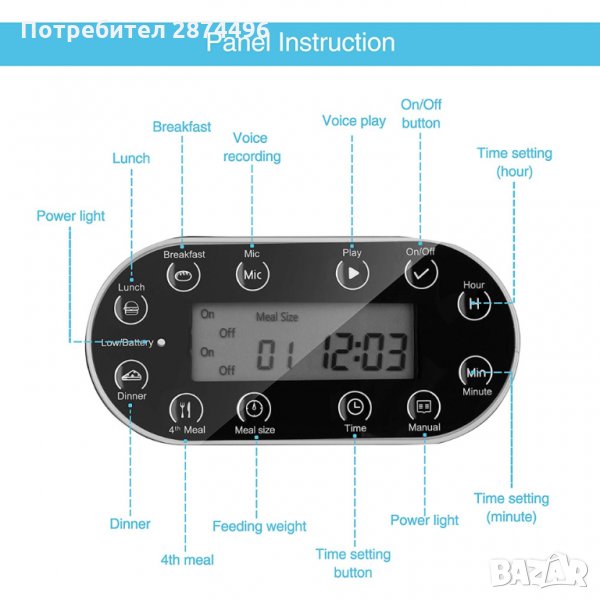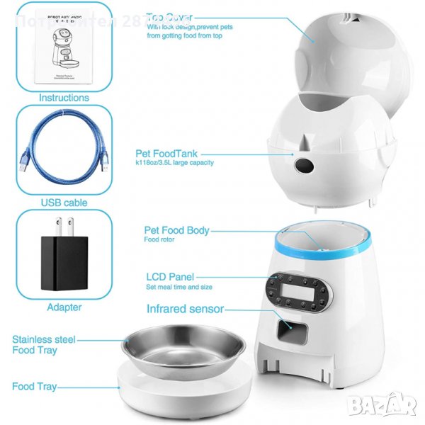 Хранилката е оборудвана с дисплей и таймер, които ви позволяват да настроите часовете и пътите на пускане на храна, както и да създадете 10 секундно аудио, приканващо вашия любимец за храна, без дори да сте вкъщи.