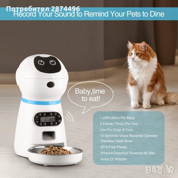 Аудио записът е 10 секунден и се пуска автоматично преди всяко хранене.