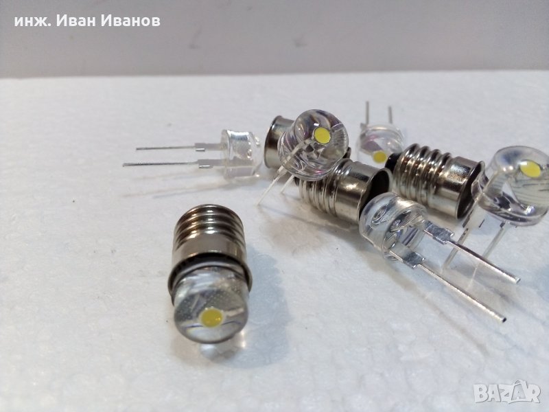 На третата снимка са показани 8мм светодиоди, които идеално пасват на цоклите Е10 като размер.
