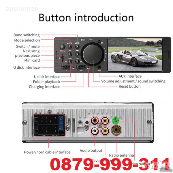 1-din Mp3 / Mp4 / Mp5 Car Player - възпроизвежда на дисплея видео клипове, филми и др.
