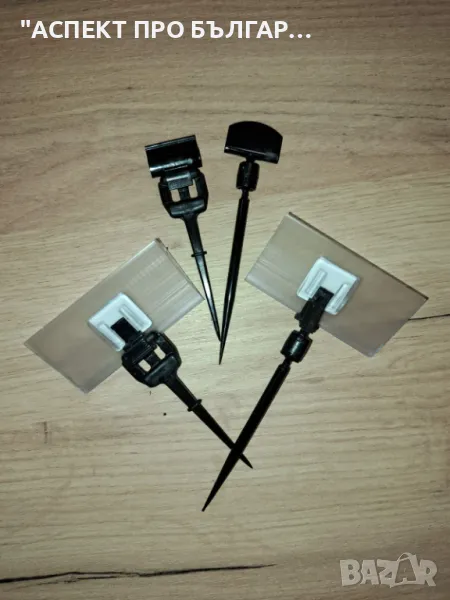 Вариации от възможни решения с игли, поставки, стойки, крепежи, щипки, окачващи елементи и др.