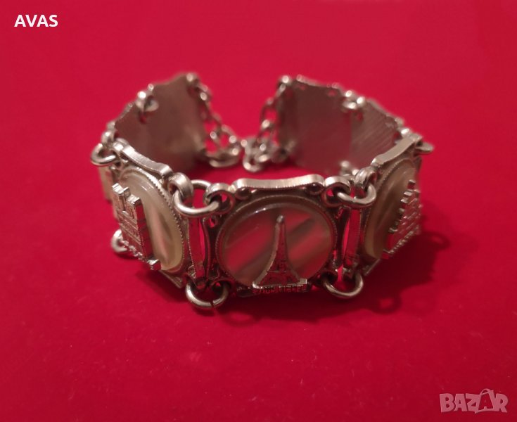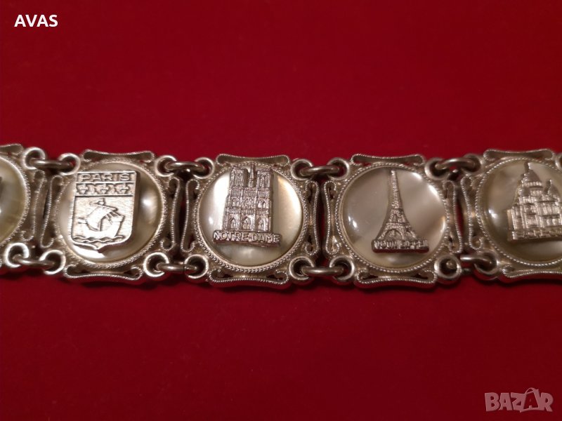 Нова дамска гривна Paris, масивна, ефект на старинност, на всяка част са поставени известни парижки сгради като Айфелова кула, Лувър, Триумфална арка и тн.. Закопчаване за синджирче, за недебела ръка
